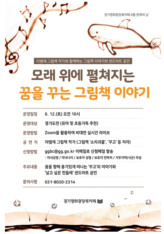경기도청 북부청사 경기평화광장 북카페에서 6월 문화의 날 행사로, 오는 12일 토요일 오전 10시부터 온라인 실시간 공연 <이범재 그림책 작가와의 만남 - 모래 위에..