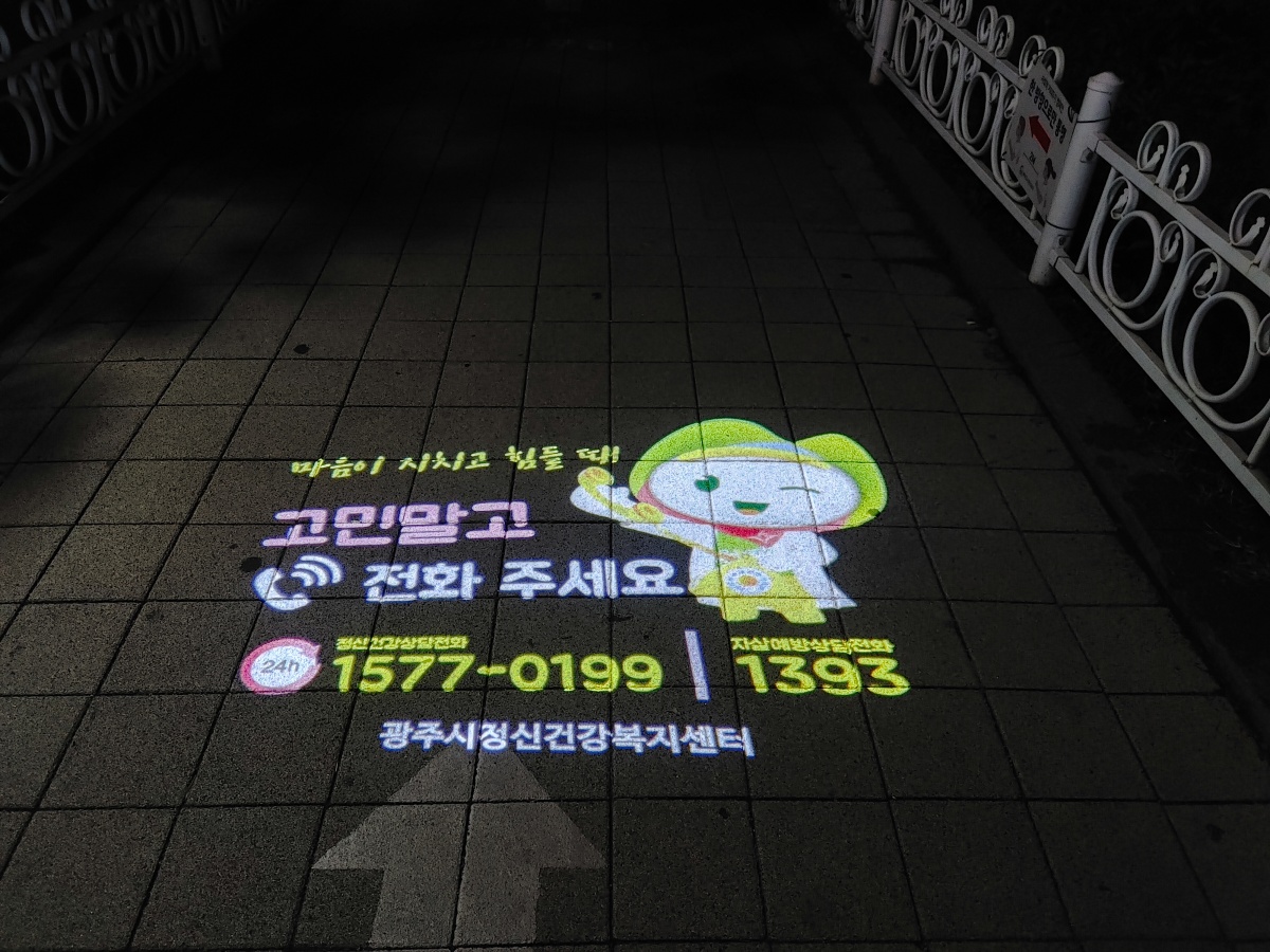 광주시는 시민의 정신건강과 생명존중문화 확산을 위해 희망의 빛을 밝히는 ‘생명사랑 로고젝터(LED조명 광고)를 지역 내 공공장소, 유동 인구가 많은 지역 4곳에 10개의 로고젝터..